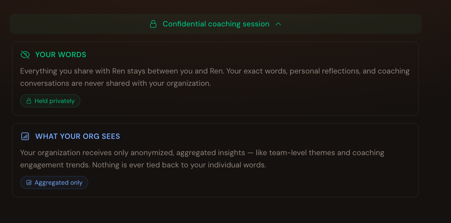 Strictly Private: Your specific coaching moments live between you and Ren. Your boss and HR never see them. They show up in your Morning Briefing and nowhere else.