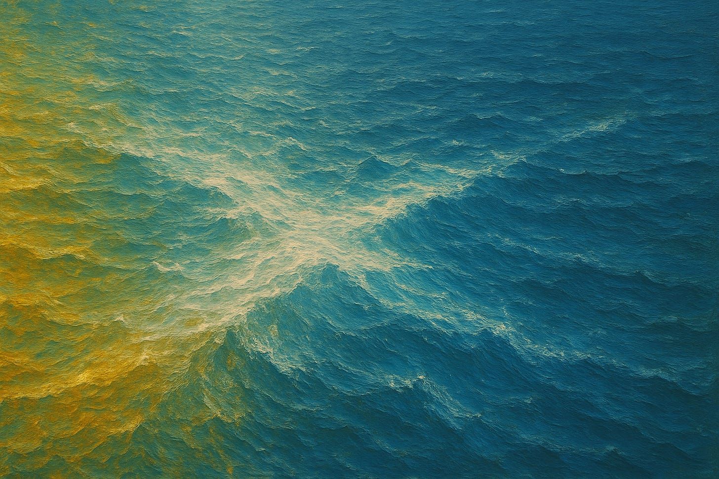 Image Prompt: An abstract oil painting of a crossroads where golden and blue waves collide, symbolizing humanity at a turning point between emotional depth and mechanical efficiency, evoking the messy transition in the nature of work. The prompt seems quite empty, doesn’t it…? Unless you’re actually at the center, experiencing it.